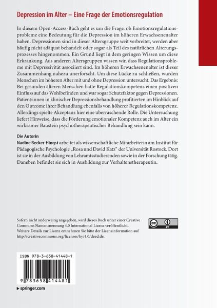 In diesem Open-Access-Buch geht es um die Frage, ob Emotionsregulationsprobleme eine Bedeutung für die Depression im höheren Erwachsenenalter haben. Depressionen sind in dieser Altersgruppe weit verbreitet, werden aber häufig nicht adäquat behandelt oder sogar als Teil des natürlichen Alterungsprozesses hingenommen. Ein Grund liegt in dem geringen Wissen um diese Erkrankung. Aus anderen Altersgruppen wissen wir, dass Regulationsprobleme mit Depressivität assoziiert sind. Im höheren Erwachsenenalter ist dieser Zusammenhang nahezu unerforscht. Um diese Lücke zu schließen, wurden Menschen im höheren Alter mit und ohne Depression untersucht. Das Ergebnis: Bei gesunden älteren Menschen hatte Regulationskompetenz einen positiven Einfluss auf das Wohlbefinden und war sogar Schutzfaktor gegen Depressionen. Patient:innen in klinischer Depressionsbehandlung profitierten im Hinblick auf den Outcome ihrer Behandlung ebenfalls von höherer Regulationskompetenz. Allerdings spielte Akzeptanz hier eineüberraschende Rolle. Die Untersuchung liefert Hinweise, dass die Förderung emotionaler Kompetenz auch im Alter ein wirksamer Baustein psychotherapeutischer Behandlung sein kann.