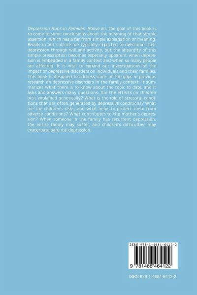 "Depression runs in families." Above all, the goal of thisbook is to come to some conclusions about the meaning ofthat simple assertion, which has a far from simple ex-planation of meaning. This book is designed to address someof the gaps in previous research on depressive disorders inthe family context: the sheer numbers of people withaffective disorders marks them as our most commonpsychiatric problem.
