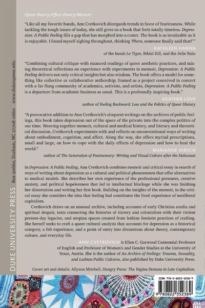 Ann Cvetkovich combines memoir and cultural critique in search of ways of writing about depression as a public cultural and political phenomenon rather than as a personal medical pathology.