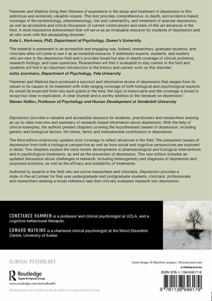 Depression provides a valuable and accessible resource for students, practitioners, and researchers seeking an up-to-date overview and summary of research-based information about depression. With the help of clinical examples, the authors present chapters covering the hypothesized causes of depression, including genetic and biological factors, life stress, family, and interpersonal contributors to depression. The third edition extensively updates prior coverage to reflect advances in the field. The presumed causes of depression from both a biological perspective as well as from social and cognitive perspectives are explored in detail. Two chapters explore the most recent developments in pharmacological and biological interventions and in psychological treatments, as well as the prevention of depression. This new edition includes updated discussion about challenges in research, including heterogeneity and diagnosis of depression and proposed solutions, as well as the efficacy and availability of treatments. Authored by experts in the field who are active researchers and clinicians, Depression provides a state-of-the-art primer for final year undergraduate and postgraduate students, clinicians, professionals, and researchers seeking a broad reference task that critically evaluates research into depression.