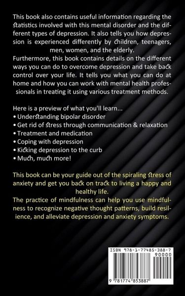 This book also contains useful information regarding the statistics involved with this mental disorder and the different types of depression. It also tells you how depression is experienced differently by children, teenagers, men, women, and the elderly. Furthermore, this book contains details on the different ways you can do to overcome depression and take back control over your life. It tells you what you can do at home and how you can work with mental health professionals in treating it using various treatment methods. Here is a preview of what you'll learn... ¿ Understanding bipolar disorder ¿ Get rid of stress through communication & relaxation ¿ Treatment and medication ¿ Coping with depression ¿ Kicking depression to the curb ¿ Much, much more! This book can be your guide out of the spiraling stress of anxiety and get you back on track to living a happy and healthy life. The practice of mindfulness can help you use mindfulness to recognize negative thought patterns, build resilience, and alleviate depression and anxiety symptoms.