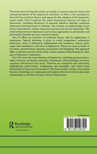 First published in 1992. This book aims to bring the reader up to date on current research, theory and conceptualisations of the depressive disorders. It offers a new perspective derived from evolution theory and argues for the adoption of the biopsycho social model. Part I explores the major distinctions between all types of depression, including discussion of seasonal affective disorder, postnatal depression and depression in children. The chapter on epidemiology covers issues of prevalence, relapse, long term outcome and chronic depression. The relationship between depression and various approaches to personality and personality disorder are also covered in detail. Part II offers an overview of evolution theory and its application to depression. Special attention is given to social comparison, submissive behaviour, sense of inferiority, helplessness and weakness, shame, guilt, anger and resentment, and envy in depression. These are seen to relate to two basic, central human concerns, social power and belonging. This approach offers a coherent account of why these various aspects of functioning are often part of depressive experience. Part III covers the major theories of depression, including psychoanalytic, object relations, archetype, mentality, attachment, self psychology, incentive, cognitive, behavioural and social. Theories are compared and contrasted, highlighting controversies, weaknesses and strengths, and where cross fertilisation of ideas may be beneficial. The final chapter outlines why simple theories of aetiology are inadequate and explores the role of culture and social relationships as elicitors of many forms of depression.