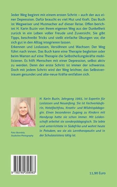 Jeder Weg beginnt mit einem ersten Schritt, auch der aus einer Depression. Dafür braucht es viel Mut und Kraft. Das Buch ist Wegweiser und Mutmacher auf dieser Reise. Offen berichtet H. Karin Buzin von ihrem eigenen Weg aus der Dunkelheit zurück in ein Leben voller Freude und Zuversicht. Sie gibt Tipps, beschreibt Tricks und stellt einfache Übungen vor, die sich gut in den Alltag integrieren lassen.