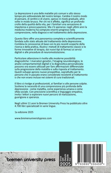 La depressione è una delle malattie più comuni e allo stesso tempo più sottovalutate del nostro tempo. Cambia il nostro modo di pensare, di sentire e di vivere, spesso in modo graduale, altre volte in modo brusco. Per chi ne è affetto, significa un profondo crollo della qualità della vita, per i familiari una sensazione di impotenza e preoccupazione. Ma c'è speranza: negli ultimi anni la medicina moderna ha compiuto enormi progressi nella comprensione, nella diagnosi e nel trattamento della depressione. Questo libro offre una panoramica completa e scientificamente fondata sullo stato attuale del trattamento della depressione. Combina le conoscenze di base con le più recenti scoperte della ricerca e della pratica, illustra i metodi di trattamento classici e le forme innovative di terapia, dai nuovi tipi di farmaci ai servizi digitali e alle procedure di neuromodulazione. Particolare attenzione è rivolta alle moderne possibilità diagnostiche: I marcatori genetici, l'imaging neurobiologico, le analisi comportamentali digitali e la diagnostica personalizzata possono ora essere utilizzati per fare affermazioni differenziate sulla progressione della malattia e sulla risposta al trattamento. Questi sviluppi aprono nuove prospettive, soprattutto per le persone che in passato erano considerate resistenti al trattamento o che non erano incluse nei sistemi di cura tradizionali. Il libro si rivolge ai professionisti, ai familiari e alle persone colpite. Sostiene la necessità di una comprensione più profonda della depressione - come malattia, come esperienza umana e come sfida sociale. Con precisione scientifica e linguaggio empatico, invita i lettori a esplorare nuovi percorsi di realizzazione, guarigione e speranza. Negli ultimi 11 anni la Bremen University Press ha pubblicato oltre 4.700 libri specializzati in varie lingue.