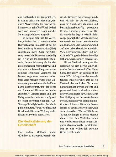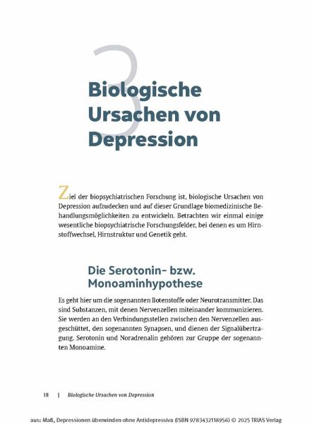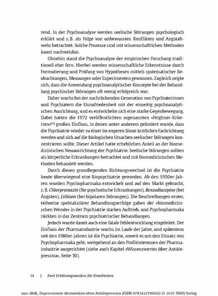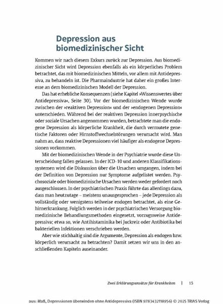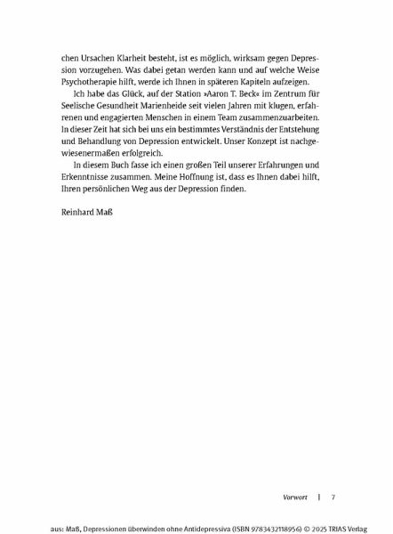 Prof. Dr. Reinhard Maß, leitender Psychologe am Zentrum für Seelische Gesundheit Marienheide (ZSGM) am Klinikum Oberberg, rät aufgrund der aktuellen Forschungslage von der Verwendung von Antidepressiva dringend ab. Er behandelt auf seiner Psychotherapiestation seit Jahren schwer depressive Patienten und hat in mehreren Fachveröffentlichungen gezeigt, dass Antidepressiva dabei überflüssig sind. In diesem Buch