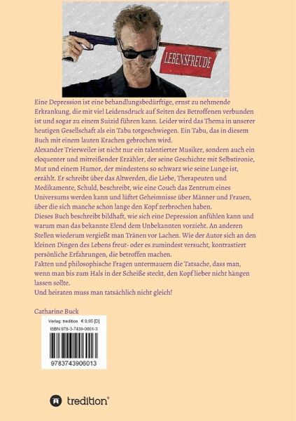 Eine Depression ist eine behandlungsbedürftige, ernst zu nehmende Erkrankung, die mit viel Leidensdruck auf Seiten des Betroffenen verbunden ist und sogar zu einem Suizid führen kann. Leider wird das Thema in unserer heutigen Gesellschaft als ein Tabu totgeschwiegen. Ein Tabu, das in diesem Buch mit einem lauten Krachen gebrochen wird.Alexander Trierweiler ist nicht nur ein talentierter Musiker, sondern auch ein eloquenter und mitreißender Erzähler, der seine Geschichte mit Selbstironie, Mut und einem Humor, der mindestens so schwarz wie seine Lunge ist, erzählt. Er schreibt über das Altwerden, die Liebe, Therapeuten und Medikamente, Schuld, beschreibt, wie eine Couch das Zentrum eines Universums werden kann und lüftet Geheimnisse über Männer und Frauen, über die sich manche schon lange den Kopf zerbrochen haben. Dieses Buch beschreibt bildhaft, wie sich eine Depression anfühlen kann und warum man das bekannte Elend dem Unbekannten vorzieht. An anderen Stellen wiederum vergießt man Tränen vor Lachen. Wie der Autor sich an den kleinen Dingen des Lebens freut- oder es zumindest versucht, kontrastiert persönliche Erfahrungen, die betroffen machen.Fakten und philosophische Fragen untermauern die Tatsache, dass man, wenn man bis zum Hals in der Scheiße steckt, den Kopf lieber nicht hängen lassen sollte.Und heiraten muss man tatsächlich nicht gleich!