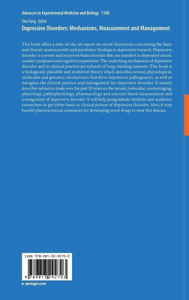 An Overview of Depressive Disorder.- Genetic advance in depressive disorder.- Neuroimaging advance in major depressive disorder.- Neuroimmune advance in depressive disorder.- Neurophysiologic advance in major depressive disorder.- Biological rhythms advance in depressive disorder.- Advances in molecular and circuitry mechanisms of depressive disorder - A focus on lateral habenula.- Advance in stress for depressive disorder.- Advance in diagnosis of major depressive disorders.- Standardized treatment strategy for depressive disorder.- Optimized treatment strategy for depressive disorder.- Individualized treatment strategy for depressive disorder.- Psychological Treatment for Depression.- Internet-based management for depressive disorder.- Potential Anti-depressive treatment maneuvers from bench to bedside