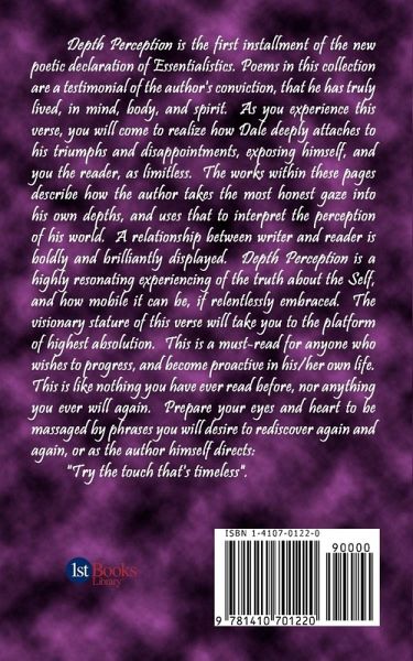 Depth Perception, the provocative first success of Essentialist poet Dale R. Roettgen, is an instant bestseller of the freshest philosophies put into verse. This book of poetry is certain to leave the shelves empty, as fast as they are filled.