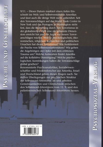 9/11. - Dieses Datum markiert einen tiefen Einschnitt im Welt- und Selbstverständnis Amerikas und lässt auch die übrige Welt nicht unberührt. Seit den Terroranschlägen auf das World Trade Center in New York und das Pentagon in Washington steht fest, dass die Bedrohung durch den Terrorismus in der globalisierten Welt eine nie gekannte Dimension erreicht hat und die Angst vor neuen Terroranschlägen wächst. Welche psychologischen, ökonomischen, religiösen, kulturellen und politischen Ursachen hat dieser Terrorismus? Wie funktioniert die Psyche von Selbstmordattentätern? Wie gehen die Angehörigen der Opfer mit dem erlittenen Trauma um? Welche Antworten findet Amerika auf die kollektive Demütigung? Welche psychologischen Auswirkungen haben die Terroranschläge global gesehen? Solchen Fragen gehen Autorinnen und Autoren aus Amerika, Israel und Deutschland in diesem Band nach. Sie stellen Überlegungen zur psychischen Struktur der Selbstmord-Attentäter an und arbeiten Gemeinsamkeiten und Unterschiede zwischen den Selbstmord-Attentätern vom 11. 9. und den palästinensischen Selbstmord-Attentätern heraus.