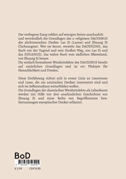 Der vorliegene Essay erklärt auf wenigen Seiten anschaulich und verständlich die Grundlagen des a-religiösen DAOISMUS der altchinesischen Denker Lao Zi (Laotse) und Zhuang Zi (Tschuangtse). Wer sie kennt, versteht das DAODEJING, das Buch von der Tugend und vom Großen Weg, von Lao Zi und das ZHUANGZI, das wahre Buch vom südlichen Blütenland, von Zhuang Zi besser. Die Weisheitslehre des DAOISMUS beruht auf natürlichen Grundlagen, ist einfach zu verstehen und versteht sich als ein Plädoyer für Menschlichkeit und Frieden. Das Buch richtet sich in erster Linie an Leserinnen und Leser, die am asiatischen Denken interessiert sind und sich im Selbststudium weiterbilden wollen. Die Grundlagen der daostischen Weisheitslehre als Lebenkunst werden mit Hilfe von drei anschaulichen Geschichten von Zhuang Zi und einer Reihe von Begriffsnetzen bzw. Kernaussagen europäischer Denker erläutert.