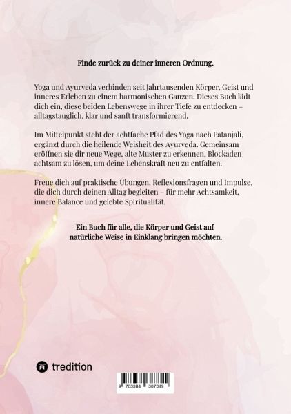 "Der achtfache Yogapfad - mit Ayurveda den Körper nähren, mit Yoga den Geist befreien" ist ein ganzheitlicher Ratgeber für alle, die im hektischen Alltag nach innerer Ruhe, Energie und Ausgeglichenheit suchen. Mit leicht umsetzbaren Tipps, inspirierenden Impulsen und praktischen Übungen zeigt dieses Buch, wie du mit den Prinzipien des Yoga und der Heilkraft des Ayurveda Körper, Geist und Seele in Einklang bringst. Ideal für Einsteiger wie Fortgeschrittene, die Spiritualität und Selbstfürsorge bewusst in ihr Leben integrieren möchten.