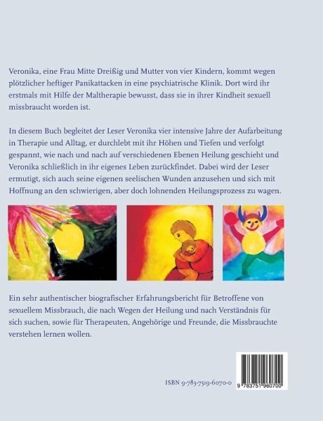 Veronika, eine Frau Mitte Dreißig und Mutter von vier Kindern, kommt wegen plötzlicher Panikattacken in eine psychiatrische Klinik. Dort wird ihr erstmals mit Hilfe der Maltherapie bewusst, dass sie in ihrer Kindheit sexuell missbraucht worden ist.In diesem Buch begleitet der Leser Veronika vier intensive Jahre der Aufarbeitung in Therapie und Alltag, er durchlebt mit ihr Höhen und Tiefen und verfolgt gespannt, wie nach und nach auf verschiedenen Ebenen Heilung geschieht und Veronika schließlich in ihr eigenes Leben zurückfindet. Dabei wird der Leser ermutigt, sich auch seine eigenen seelischen Wunden anzusehen und sich mit Hoffnung an den schwierigen, aber doch lohnenden Heilungsprozess zu wagen.Ein sehr authentischer biografischer Erfahrungsbericht für Betroffene von sexuellem Missbrauch, die nach Wegen der Heilung und nach Verständnis für sich suchen, sowie für Therapeuten, Angehörige und Freunde, die Missbrauchte verstehen lernen wollen.