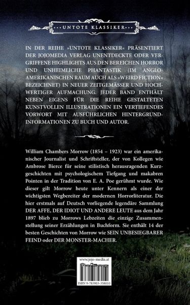 William Chambers Morrow (1854 -1923) war ein amerikanischer Journalist und Schriftsteller, der von Kollegen wie Ambrose Bierce für seine stilistisch herausragenden Erzählungen mit psychologischem Tiefgang und makabren Pointen in der Tradition von E.A. Poe gerühmt wurde. Wie dieser gilt Morrow heute unter Kennern als einer der wichtigsten Wegbereiter der modernen Horrorliteratur. Die hier erstmals auf Deutsch vorliegende legendäre Kurzgeschichtensammlung DER AFFE, DER IDIOT UND ANDERE LEUTE aus dem Jahr 1897 blieb zu Morrows Lebzeiten die einzige Zusammenstellung seiner Stories in Buchform. Sie enthält 14 der besten Geschichten von Morrow wie SEIN UNBESIEGBARER FEIND oder DER MONSTER-MACHER. In der Reihe UNTOTE KLASSIKER präsentiert der JOJOMEDIA Verlag unentdeckte , vergessene oder vergriffene Highlights aus den Bereichen Horror und Unheimliche Phantastik (im angloamerikanischen Raum auch als "Weird Fiction" bezeichnet) in neuer, zeitgemäßer und hochwertiger Aufmachung. Jeder Band enthält neben eigens für die Reihe UNTOTE KLASSIKER gestalteten kunstvollen Illustrationen auch ein vertiefendes Vorwort mit ausführlichen Hintergrundinformationen zu Buch und Autor.