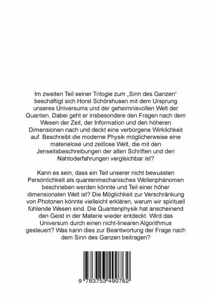 Im zweiten Teil seiner Trilogie zum Sinn des Ganzen beschäftigt sich Horst Schörshusen mit dem Ursprung unseres Universums und der geheimnisvollen Welt der Quanten. Dabei geht er insbesondere den Fragen nach dem Wesen der Zeit, der Information und den höheren Dimensionen nach und deckt eine verborgene Wirklichkeit auf. Beschreibt die moderne Physik möglicherweise eine materielose und zeitlose Welt, die mit den Jenseitsbeschreibungen der alten Schriften und den Nahtoderfahrungen vergleichbar ist? Kann es sein, dass ein Teil unserer nicht bewussten Persönlichkeit als quantenmechanisches Wellenphänomen beschrieben werden könnte und Teil einer höher dimensionalen Welt ist? Die Möglichkeit zur Verschränkung von Photonen könnte vielleicht erklären, warum wir spirituell fühlende Wesen sind. Die Quantenphysik hat anscheinend den Geist in der Materie wieder entdeckt. Wird das Universum durch einen nicht-linearen Algorithmus gesteuert? Was kann das zur Beantwortung der Frage nach dem Sinn des Ganzen beitragen?