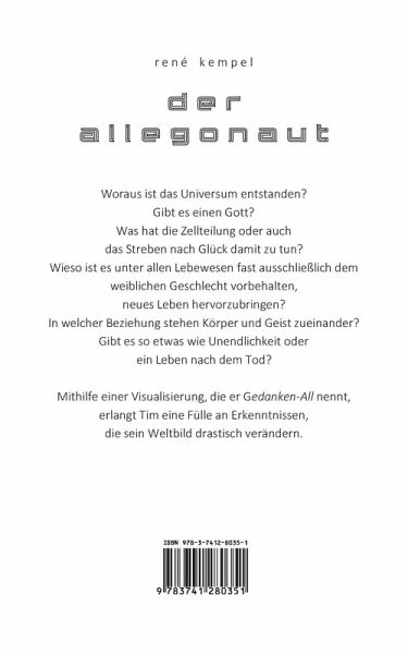 Woraus ist das Universum entstanden? Gibt es einen Gott?Was hat die Zellteilung oder auch das Streben nach Glück damit zu tun?Wieso ist es unter allen Lebewesen fast ausschließlich dem weiblichen Geschlecht vorbehalten, neues Leben hervorzubringen?In welcher Beziehung stehen Körper und Geist zueinander?Gibt es so etwas wie Unendlichkeit oder ein Leben nach dem Tod?Mithilfe einer Visualisierung, die er Gedanken-All nennt, erlangt Tim eine Fülle an Erkenntnissen, die sein Weltbild drastisch verändern.