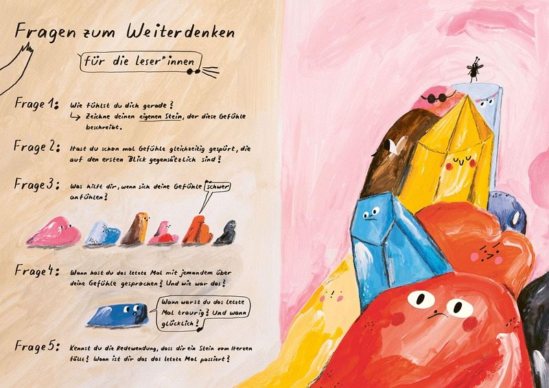 Die Raupe Waldi versteht die Welt nicht mehr. Woher kommt dieser schwere Klumpen auf ihrem Rücken, der sich selbst Alleinstein nennt? Auf ihrer Reise durch Brombeerhecken, Wälder und Wiesen trifft sie andere Tiere, die ebenfalls besondere Steine tragen. Den Neinstein, den Kleinstein, den Weinstein. Jede Begegnung erzählt von Gefühlen wie Traurigkeit, Unsicherheit oder Müdigkeit und davon, wie es leichter werden kann, wenn man diese Gefühle teilt. Mit leuchtenden Illustrationen erschafft Hilde Biedermann Bildwelten, in denen Emotionen sichtbar werden. Das Bilderbuch eröffnet einen kindgerechten Zugang zu Gesprächen über schwierige Gefühle und lädt Kinder wie Erwachsene dazu ein, Emotionen wahrzunehmen, anzunehmen und auszudrücken.