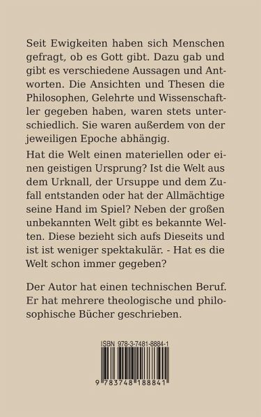 Seit Ewigkeiten haben sich Menschen gefragt, ob es Gott gibt. Dazu gab und gibt es verschiedene Aussagen und Antworten. Die Ansichten und Thesen die Philosophen, Gelehrte und Wissenschaftler gegeben haben, waren stets unterschiedlich. Sie waren außerdem von der jeweiligen Epoche abhängig. Hat die Welt einen materiellen oder einen geistigen Ursprung? Ist die Welt aus dem Urknall, der Ursuppe und dem Zufall entstanden oder hat der Allmächtige seine Hand im Spiel? Neben der großen unbekannten Welt gibt es bekannte Welten. Diese bezieht sich aufs Dieseits und ist weniger spektakulär.- Hat es die Welt schon immer gegeben?