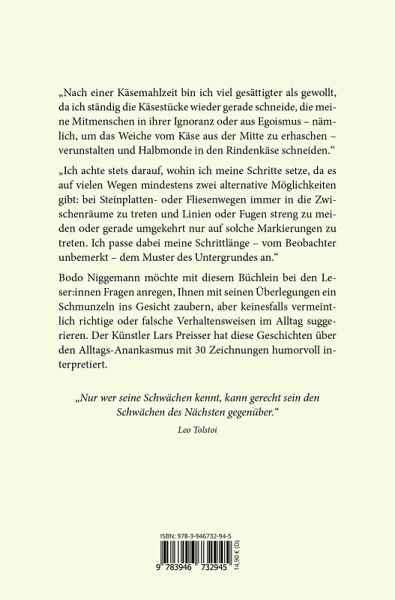 "Nach einer Käsemahlzeit bin ich viel gesättigter als gewollt, da ich ständig die Käsestücke wieder gerade schneide, die meine Mitmenschen in ihrer Ignoranz oder aus Egoismus - nämlich, um das Weiche vom Käse aus der Mitte zu erhaschen - verunstalten und Halbmonde in den Rindenkäse schneiden." "Ich achte stets darauf, wohin ich meine Schritte setze, da es auf vielen Wegen mindestens zwei alternative Möglichkeiten gibt: bei Steinplatten- oder Fliesenwegen immer in die Zwischenräume zu treten und Linien oder Fugen streng zu meiden oder gerade umgekehrt nur auf solche Markierungen zu treten. Ich passe dabei meine Schrittlänge - vom Beobachter unbemerkt - dem Muster des Untergrundes an."Bodo Niggemann möchte mit diesem Büchlein bei den Leser:innen Fragen anregen, Ihnen mit seinen Überlegungen ein Schmunzeln ins Gesicht zaubern, aber keinesfalls vermeintlich richtige oder falsche Verhaltensweisen im Alltag suggerieren. Der Künstler Lars Preisser hat diese Geschichten über den Alltags-Anankasmus mit 30 Zeichnungen humorvoll interpretiert.