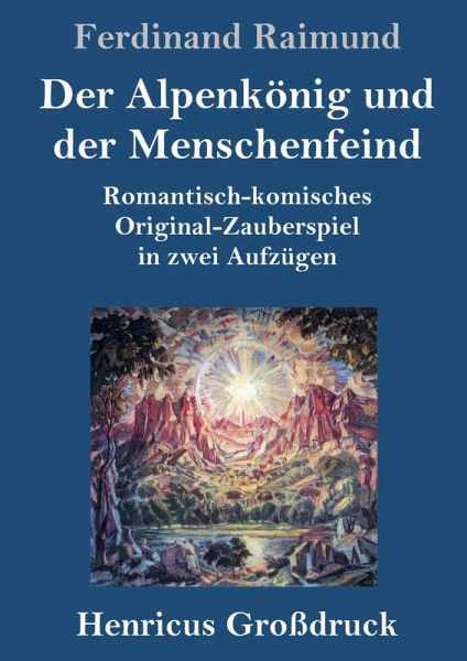 Ferdinand Raimund: Der Alpenkönig und der Menschenfeind. Romantisch-komisches Original-Zauberspiel in zwei Aufzügen Lesefreundlicher Großdruck in 16-pt-Schrift Großformat, 210 x 297 mm Berliner Ausgabe, 2019 Durchgesehener Neusatz mit einer Biographie des Autors bearbeitet und eingerichtet von Theodor Borken Entstanden 1828. Erstdruck: Wien 1828. Uraufführung am 17.10.1828 in Wien. Textgrundlage ist die Ausgabe: Ferdinand Raimund: Sämtliche Werke. Herausgegeben von Friedrich Schreyvogl, München: Winkler, 1960. Umschlaggestaltung von Thomas Schultz-Overhage unter Verwendung des Bildes: Konstantin Bogaevsky, Gebirgslandschaft, 1942. Gesetzt aus der Minion Pro, 16 pt.