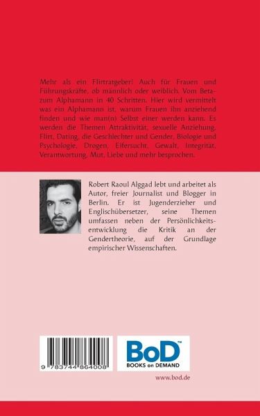 Mehr als ein Flirtratgeber! Auch für Frauen und Führungskräfte, ob männlich oder weiblich. Vom Beta- zum Alphamann in 40 Schritten.Im Alpha Kurs verschlüsselt findet sich das Geheimnis der männlichen Anziehungskraft, das Wissen und sogar eine Anleitung dazu, wie man von einem Beta- zu einem Alphamann werden kann - einem auf natürliche Weise für Frauen attraktiven Menschen, der ein besonderes Ansehen in jeder gesellschaftlichen Gruppe genießt.Das Buch und der darin enthaltene Kurs vermitteln, was ein Alphamann ist, warum Frauen ihn anziehend finden und wie man zu einem werden kann, auch werden grundlegende Genderfragen rund um die Identität der beiden Geschlechter besprochen.Der Autor verbürgt sich für die Richtigkeit und Wirksamkeit aller Konzepte in seinem Buch.Die Informationen im Alpha-Kurs entstammen 15 Jahren der Recherche, des Studiums und der Praxis auf den Gebieten der zwischenmenschlichen Kommunikation, besonders zwischen Mann und Frau, der Evolutionsbiologie, sowie persönlicher Erfahrung und werden von wissenschaftlichen Studien und Forschungen, auf die er sich beruft, gestützt.Sie vermitteln eine revolutionäre und gleichzeitig evolutionäre Sicht der Dinge auf das uralte Spiel zwischen Mann und Frau - das Buch soll beiden Geschlechtern helfen sowohl das eigene als auch das andere Geschlecht aus dessen eigener Sicht besser kennen und verstehen zu lernen, die Unterschiede und Andersartigkeiten wertschätzen zu lernen und den richtigen Umgang miteinander zu finden.Es bespricht direkt und ehrlich, in umgänglichem und leicht verständlichem Ton, die Themenbereiche Biologie, Psychologie, Evolution, Gender, Dynamik zwischen Mann und Frau, Flirten, Körpersprache, Dating, Sex, Drogen, Eifersucht, Gewalt, Verantwortung, Selbstwertgefühl, Integrität, Selbstvertrauen und Zielstrebigkeit, Mut und Liebe - sowie viele weitere interessante Themen rund um das Mann- und Frausein.Fokus des Buches ist Persönlichkeitsentwicklung. Dieses Buch versteht sich auch als eine Antwort auf und das Gegenmittel zur Gendertheorie. Ein Rundumschlag der Menschlichkeit und eine Flirtbibel, die jeder Mensch einmal gelesen haben sollte.