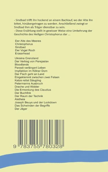 - Er trifft auf den Alten des Meeres. Dies ist der Name eines Greises. Sindbad findet ihn hockend an einem Bachlauf, wo der Alte ihn bittet, hinübergetragen zu werden. Anschließend zwingt er Sindbad auf qualvolle Weise ihm als Träger dienstbar zu sein.- Diese Erzählung stellt in gewisser Weise eine Umkehrung der Geschichte des Heiligen Christophorus dar ...Inhalt:Der Alte des Meeres, Christophorus, Sindbad, Der Vogel Roch Eraserhead, Ukraina-Grenzland, Der Vertrag von Perejaslav, Bloodlands, Parasit verlängert Leben, Der Fisch geht an Land, Impfaktion im Kölner Dom, Katze rettet Säugling, Petermanns Ausbruch, Drache und Widder, Die Ermordung des Claudius, Hitlers Scheitel, Der Buchfink, Der Raum der Technik, Aletheia, Joseph Beuys und der Lockdown, Das Schwinden der Begriffe, Der Jäger