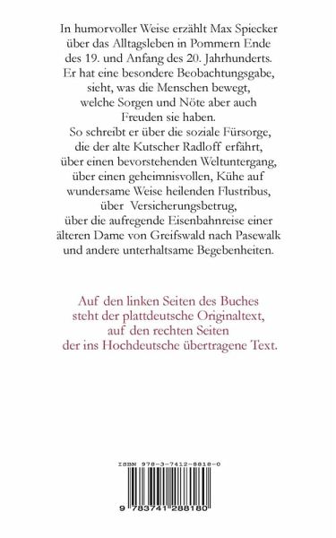 Als feinsinniger Beobachter seiner Zeitgenossen hat Max Spiecker über das Alltagsleben in Pommern Ende des 19. und Anfang des 20. Jahrhunderts geschrieben.Mit viel Verständnis und Einfühlungsvermögen hat er die Freuden, Sorgen und Nöte der Menschen in Humoresken und Anekdoten zu Papier gebracht. Vieles von dem findet sich auch in unserer doch so "modernen" Zeit wieder. So schreibt Spiecker unter anderem über den Kutscher Radloff, der im Alter soziale Fürsorge erfährt, über einen bevorstehenden Weltuntergang, über einen Flustribus, der Kühe auf geheimnisvolle Weise heilen kann, über Versicherungsbetrug, über die aufregende Eisenbahnreise einer älteren Dame von Greifswald nach Pasewalk, über einen Erbonkel aus Cincinnati, der in seine Heimat Hinterpommern zurückkehren möchte. Das Buch ist im Original in plattdeutscher Sprache erschienen.Erstmals ist es jetzt ins Hochdeutsche übertragen worden. Auf den linken Seiten des Buches steht der plattdeutsche Originaltext, auf den rechten Seiten der ins Hochdeutsche übertragene Text.