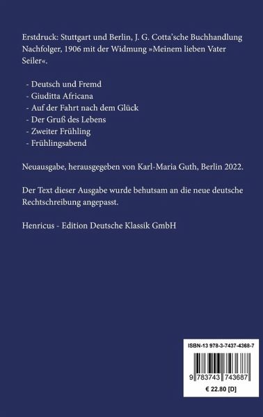 Rudolf Herzog: Der alten Sehnsucht Lied. ErzählungenErstdruck: Stuttgart und Berlin, J. G. Cotta'sche Buchhandlung Nachfolger, 1906 mit der Widmung »Meinem lieben Vater Seiler«.Inhaltsverzeichnis:Deutsch und Fremd.Giuditta Africana.Auf der Fahrt nach dem Glück.Der Gruß des Lebens.Zweiter Frühling.Frühlingsabend.Neuausgabe, herausgegeben von Karl-Maria Guth, Berlin 2023.Der Text dieser Ausgabe wurde behutsam an die neue deutsche Rechtschreibung angepasst.Umschlagabbildung: William Parkinson, Loggia dei Lanzi in Florenz, 1908Gesetzt aus der Minion Pro, 11 pt.Die Sammlung Hofenberg erscheint im Verlag Henricus - Edition Deutsche Klassik GmbH, Berlin