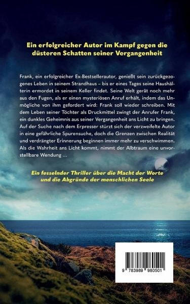 Ein erfolgreicher Autor im Kampf gegen die düsteren Schatten seiner Vergangenheit Ein fesselnder Thriller über die Macht der Worte und die Abgründe der menschlichen Seele Frank, ein erfolgreicher Ex-Bestsellerautor, genießt sein zurückgezogenes Leben in seinem Strandhaus – bis er eines Tages seine Haushälterin ermordet in seinem Keller findet. Seine Welt gerät noch mehr aus den Fugen, als er einen mysteriösen Anruf erhält, indem das Unmögliche von ihm gefordert wird: Frank soll wieder schreiben. Mit dem Leben seiner Töchter als Druckmittel zwingt der Anrufer Frank, ein dunkles Geheimnis aus seiner Vergangenheit ans Licht zu bringen. Auf der Suche nach dem Erpresser stürzt sich der verzweifelte Autor in eine gefährliche Spurensuche, doch die Grenzen zwischen Realität und verdrängter Erinnerung beginnen immer mehr zu verschwimmen. Als die Wahrheit ans Licht kommt, nimmt der Albtraum eine unvorstellbare Wendung … Erste Leser:innenstimmen „Franks verzweifelter Kampf gegen den unbekannten Erpresser und seine innere Zerrissenheit sind so packend beschrieben!" „Dieser Psychothriller kombiniert psychologische Tiefe mit rasanter Action." „Franks Reise durch seine düstere Vergangenheit und die aufkeimende Bedrohung sind so nervenaufreibend beschrieben, dass ich gar nicht mehr aufhören konnte zu lesen!" „Dieser packender Thriller bietet alles, was er soll: eine packende Geschichte, emotionale Tiefe und einen ständigen Nervenkitzel."