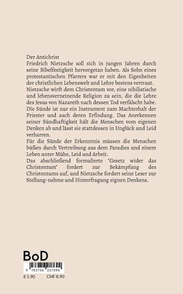 Der AntichristFriedrich Nietzsche soll sich in jungen Jahren durch seine Bibelfestigkeit hervorgetan haben. Als Sohn eines protestantischen Pfarrers war er mit den Eigenheiten der christlichen Lebenswelt und Lehre bestens vertraut.Nietzsche wirft dem Christentum vor, eine nihilistische und lebensverneinende Religion zu sein, die die Lehre des Jesus von Nazareth nach dessen Tod verfälscht habe. Die Sünde ist nur ein Instrument zum Machterhalt der Priester und auch deren Erfindung. Das Anerkennen seiner Sündhaftigkeit hält die Menschen vom eigenen Denken ab und lässt sie stattdessen in Unglück und Leid verharren. Für die Sünde der Erkenntnis müssen die Menschen büßen durch Vertreibung aus dem Paradies und einem Leben unter Mühe, Leid und Arbeit.Das abschließend formulierte "Gesetz wider das Christentum" fordert zur Bekämpfung des Christentums auf, und Nietzsche fordert seine Leser zur Stellungnahme und Hinterfragung eignen Denkens.