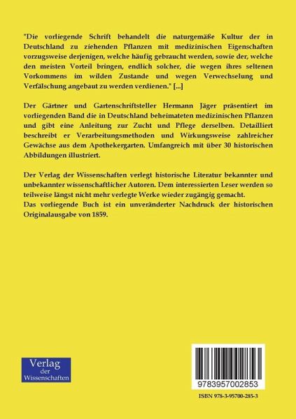 Der Gärtner und Gartenschriftsteller Hermann Jäger präsentiert im vorliegenden Band die in Deutschland beheimateten medizinischen Pflanzen und gibt eine Anleitung zur Zucht und Pflege derselben. Detailliert beschreibt er Verarbeitungsmethoden und Wirkungsweise zahlreicher Gewächse aus dem Apothekergarten. Umfangreich mit über 30 historischen Abbildungen illustriert.
