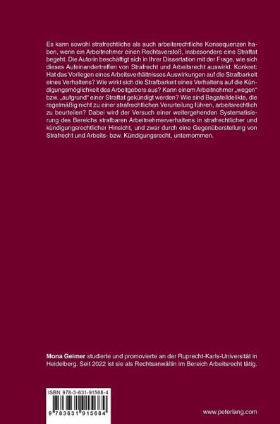 Die Autorin beschäftigt sich in Ihrer Dissertation mit der Frage, wie sich dieses Aufeinandertreffen von Strafrecht und Arbeitsrecht auswirkt. Konkret: Hat das Vorliegen eines Arbeitsverhältnisses Auswirkungen auf die Strafbarkeit eines Verhaltens? Wie wirkt sich die Strafbarkeit eines Verhaltens auf die Kündigungsmöglichkeit des Arbeitgebers aus? Kann einem Arbeitnehmer "wegen" bzw. "aufgrund" einer Straftat gekündigt werden? Wie sind Bagatelldelikte, die regelmäßig nicht zu einer strafrechtlichen Verurteilung führen, arbeitsrechtlich zu beurteilen?
