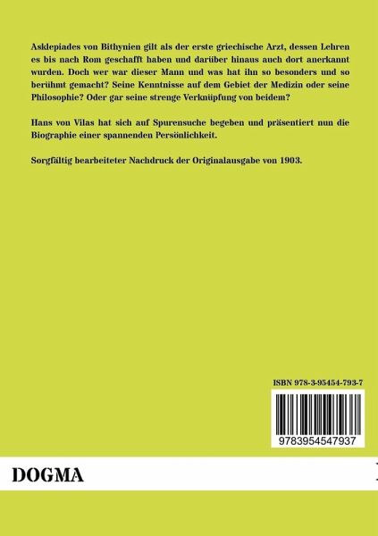Asklepiades von Bithynien gilt als der erste griechische Arzt, dessen Lehren es bis nach Rom geschafft haben und darüber hinaus auch dort anerkannt wurden. Doch wer war dieser Mann und was hat ihn so besonders und so berühmt gemacht? Seine Kenntnisse auf dem Gebiet der Medizin oder seine Philosophie? Oder gar seine strenge Verknüpfung von beidem? Hans von Vilas hat sich auf Spurensuche begeben und präsentiert nun die Biographie einer spannenden Persönlichkeit. Sorgfältig bearbeiteter Nachdruck der Originalausgabe von 1903.
