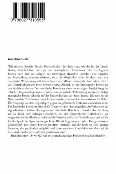 Aus dem Buch: "Die meisten Beweise für die Unsterblichkeit der Seele sind, wie die für das Dasein Gottes, Zirkelschlüsse oder gar nur tautologische Definitionen. Der teleologische Beweis, nach dem die Anlagen des kurzlebigen Menschen irgendwie und irgendwo zur Entwicklung kommen müßten, setzt die Möglichkeit einer Fortdauer und eine moralische Weltordnung mit ihrem Sollen und Müssen voraus, die dann wieder durch die Unsterblichkeit der Seele bewiesen wird. Ähnlich ist der theologische Beweis aus den Absichten Gottes. Der moralische Beweis aus einer notwendigen Ausgleichung der irdischen Ungerechtigkeiten setzt wieder eine moralische Weltordnung voraus. Der billige analogische Beweis schließt auf die Unsterblichkeit der Seele daraus, daß auch in der Natur aus dem Tode immer neues Leben entstehe, also aus einer naturwissenschaftlichen Überzeugung, die den Ungläubigen gegen die persönliche Fortdauer einnehmen kann. Der kosmische Beweis ist eine bloße Träumerei über den möglichen Aufenthaltsort der abgeschiedenen Seelen. Der sogenannte historische Beweis ist entweder eine Berufung auf die Bibel oder behauptet fälschlich, wie der entsprechende Gottesbeweis, die Allgemeinheit des Glaubens, wobei auf die Verschiedenheit der Vorstellungen und auf die Vieldeutigkeit der Sprachworte gar keine Rücksicht genommen wird. Der gemeinsame Zirkelschluß aller dieser Beweise ist darin versteckt, daß die Seele als eine geistige Substanz, also gottähnlich aufgefaßt und dann aus dieser Ähnlichkeit von Gott auf die Seele und von der Seele auf Gott geschlossen wird." Fritz Mauthner (1849-1923) war ein deutschsprachiger Philosoph und Schriftsteller.