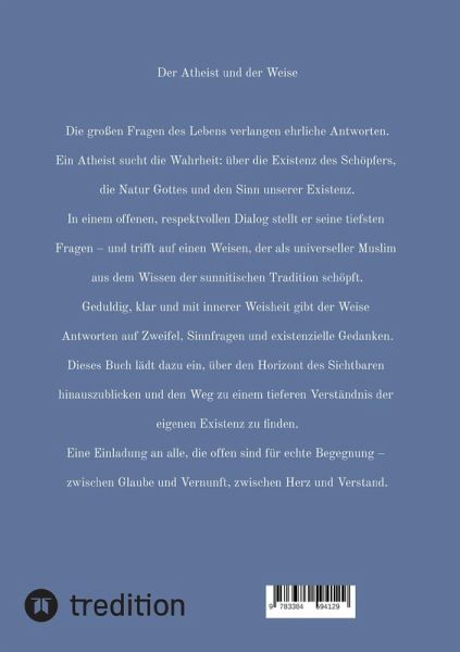 Die großen Fragen des Lebens verlangen ehrliche Antworten.Ein Atheist sucht die Wahrheit: über die Existenz des Schöpfers, die Natur Gottes und den Sinn unserer Existenz.In einem offenen, respektvollen Dialog stellt er seine tiefsten Fragen - und trifft auf einen Weisen, der als universeller Muslim aus dem Wissen der sunnitischen Tradition schöpft.Geduldig, klar und mit innerer Weisheit gibt der Weise Antworten auf Zweifel, Sinnfragen und existenzielle Gedanken.Dieses Buch lädt dazu ein, über den Horizont des Sichtbaren hinauszublicken und den Weg zu einem tieferen Verständnis der eigenen Existenz zu finden.Eine Einladung an alle, die offen sind für echte Begegnung - zwischen Glaube und Vernunft, zwischen Herz und Verstand.