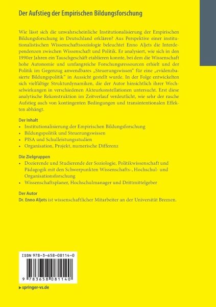 Wie lässt sich die unwahrscheinliche Institutionalisierung der Empirischen Bildungsforschung in Deutschland erklären? Aus Perspektive einer institutionalistischen Wissenschaftssoziologie beleuchtet Enno Aljets die Interdependenzen zwischen Wissenschaft und Politik. Er analysiert, wie sich in den 1990er Jahren ein Tauschgeschäft etablieren konnte, bei dem die Wissenschaft hohe Autonomie und umfangreiche Forschungsressourcen erhielt und der Politik im Gegenzug anwendbares "Steuerungswissen" für eine "evidenzbasierte Bildungspolitik" in Aussicht gestellt wurde. In der Folge entwickelten sich vielfältige Strukturdynamiken, die der Autor hinsichtlich ihrer Wechselwirkungen in verschiedenen Akteurkonstellationen untersucht. Erst diese analytische Rekonstruktion im Zeitverlauf verdeutlicht, wie sehr der rasche Aufstieg auch von kontingenten Bedingungen und transintentionalen Effekten abhängt.