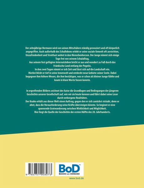 Der zehnjährige Hermann wird von seinen Mitschülern ständig provoziert und oft körperlich angegriffen. Auch außerhalb des Schullebens erlebt er seine soziale Umwelt oft zerstritten, Unzufriedenheit und Streitlust wohnt in den Menschenherzen. Der Junge nimmt sich einige Tage frei von seinem Schulalltag.Aus seinem fest gefügten Internatsleben bricht er aus und wandert zu Fuß durch das Fränkische Land entlang der Pegnitz.In den zwei Tagen nimmt er sich Zeit und lässt sich auf die Landschaft ein.Hierbei blickt er tief in seine Innenwelt und entdeckt neue Gebiete seiner Seele. Dabei begegnen ihm höhere Wesen, die ihm bestätigen, was er schon als kleiner Junge fühlte und kaum in klare Worte fassen konnte.In ergreifenden Bildern zeichnet der Autor die Grundlagen und Bedingungen der jüngeren Geschichte unserer Gesellschaft auf, wie wir sie heute kennen und führt dabei seine Leser durch verborgene Realitäten.Der Knabe erhält aus dieser Welt einen Auftrag, gegen den er sich zunächst sträubt, denn er ahnt, dass die Herausforderung seine Kräfte übersteigen könnte. So beginnt er eine spannende Gratwanderung zwischen Wirklichkeit und Möglichkeit.Hier liegt die Quelle der Geschichte der ersten Hälfte des 20. Jahrhunderts.