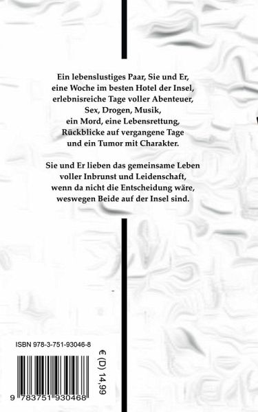 Ein lebenslustiges Paar, Sie und Er,eine Woche im besten Hotel der Insel,erlebnisreiche Tage voller Abenteuer,Sex, Drogen und Musik,ein Mord, eine Lebensrettung,Rückblicke auf vergangene Tageund ein Tumor mit Charakter.Sie und Er lieben das gemeinsame Leben voller Inbrunst und Leidenschaft, wenn da nicht die Entscheidung wäre, weswegen Beide auf der Insel sind.