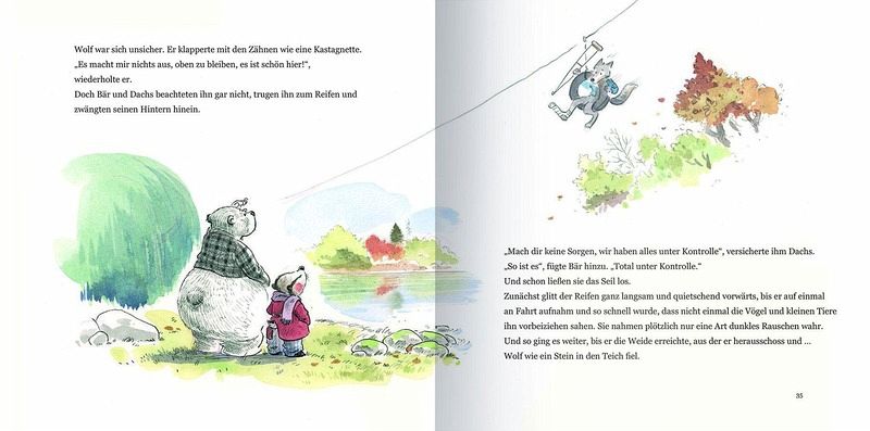 Die Bärin ist erstaunt, als sie sieht, dass ihr Mann, der Bär, seine Farbe verloren hat. Er ist grau gezeichnet und ohne jeder Farbe. Bär geht am Bach spazieren, aber er will nicht zur Dachshöhle, weil er sich mit seinem Freund gestritten hat. Aber er entdeckt im Wasser einen alten Autoreifen, den er an Land zieht. Da fällt ihm ein, dass er Wolf lange nicht gesehen hat und macht sich auf dem Weg zu ihm, da ist ein beschwerlicher Weg ganz oben auf den Berg muss er hinauf. Wolf hat ein ziemliches Durcheinander in seinem Haus und da sein Fuß verbunden ist, kann er auch nicht laufen. Doch Bär bringt in auf die Wiese und dort machen sie ein Picknick. Als Wolf nach Dachs fragt, erzählt Bär ihm von dem Streit. Da Bär nicht gut verlieren kann, hat er dem Dachs ungerechterweise die Schuld gegeben. Weil Eichhörnchen verreis ist, schreibt Bär ihm einen Brief und bittet ihn zurückzukommen. Bären schreibt Dachs und erzählt ihm, dass Bär sich versöhnen möchte. So kommt Dachs an die Tür des Bärenhauses und die Freunde beschließen Wolf zu sich zu holen, bis er gesund ist.
