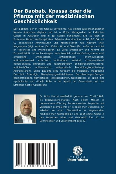 Der Baobab, der in Fon Kpassa vorkommt, hat seinen wissenschaftlichen Namen Adansonia digitata und ist in Afrika, Madagaskar, im Indischen Ozean, in Australien und in der Karibik beheimatet. Sie ist reich an Proteinen, Fetten, Kohlenhydraten, Schleim, den Vitaminen A, B1, B2, B6 und C, essentiellen Aminosäuren und Mineralstoffen wie Natrium (Na), Magnesium (Mg), Kalzium (Ca), Kalium (K) und Eisen (Fe). Außerdem enthält er Flavonoide und Phenolsäuren. Es wirkt antioxidativ und hemmt die Enzymaktivität, ist antikarzinogen, antimikrobiell und entzündungshemmend, antisickling, antibakteriell, antidiabetisch, antirheumatisch, antitrypanosomal, arthritisch, antioxidativ, antiviral, schmerzstillend, fiebersenkend, diuretisch und hepatoprotektiv, onifizierend/stimulierend, antidiarrhöisch, antientralisch, antipyretisch, Blutstillung/Wundheilung, Aphrodisiakum, Seine Extrakte sind wirksam bei Müdigkeit, Inappetenz, Durchfall, Enteralgie, Nasopharyngealinfektionen, Durchblutungsstörungen (Hämorrhoiden), Hämoptysen, Insektenstichen, Dermatosen, Er spielt eine symbolische und rituelle Rolle in der Mystik der Gesundheit und des Strebens nach Fruchtbarkeit.