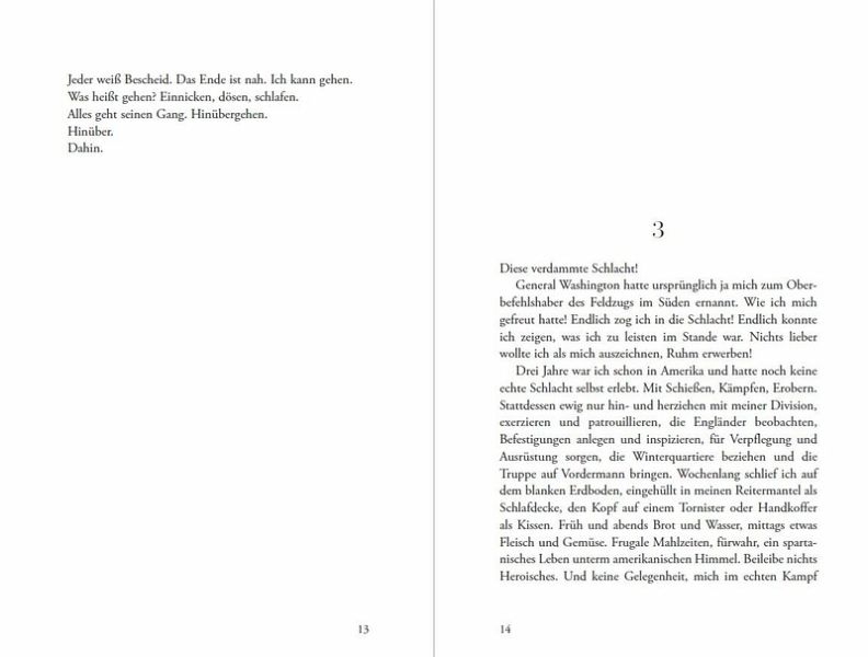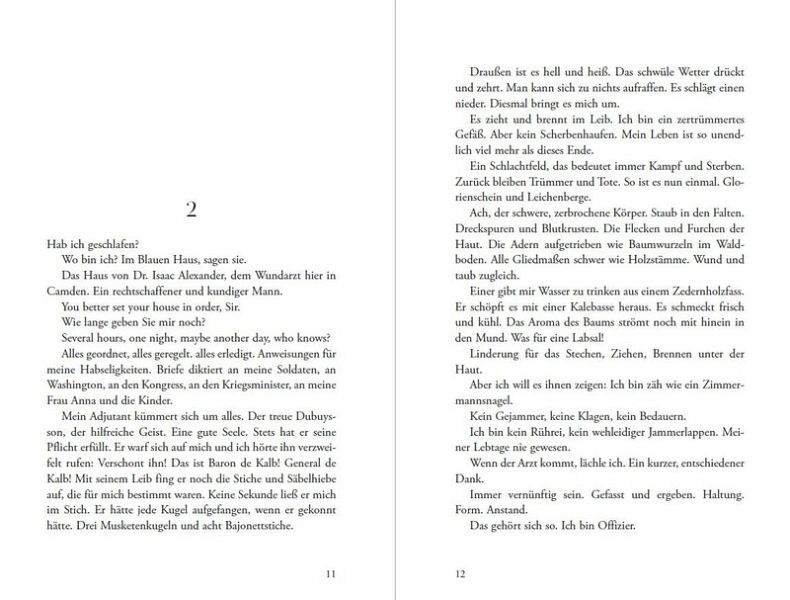 1776 erklären die Vereinigten Staaten von Amerika ihre Unabhängigkeit. Im Krieg gegen die Weltmacht England steht George Washington an der Spitze einer zusammengewürfelten Armee von Freiwilligen. Unterstützt wird er von den französischen Generälen Lafayette und de Kalb. Bei der Schlacht in Camden in South Carolina 1780 wird Baron de Kalb tödlich verwundet und infolgedessen bis heute als amerikanischer Freiheitsheld verehrt. Als er im Sterben liegt, zieht sein bewegtes Leben in seinem Geist noch einmal vorüber. Die wechselvolle Karriere bis zum Brigadegeneral in der französischen Armee, seine Familie bei Versailles mit der jungen Frau und den drei unmündigen Kindern, seine Freundschaft mit Washington und Lafayette, die Jugend in Franken, seine Kindheit als Bauernsohn in Hüttendorf bei Erlangen. Und auch die dunklen Flecken seiner Vergangenheit tauchen wieder auf ...