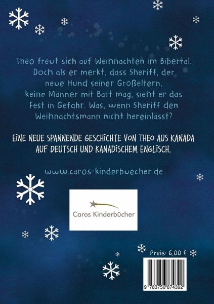 Theo freut sich auf Weihnachten im Bibertal. Doch als er merkt, dass Sheriff, der neue Hund seiner Großeltern, keine Männer mit Bart mag, sieht er das Fest in Gefahr. Was, wenn Sheriff den Weihnachtsmann nicht hereinlässt? Theo hat einen außergewöhnlichen Plan, um das Fest zu retten. Nach dem Buch "Fischstäbchen zum Frühstück - (Vor-)lesegeschichten von Theo aus Kanada", gibt es nun eine stimmungsvolle und spannende Weihnachtsgeschichte von Theo - auf Deutsch und kanadischem Englisch.