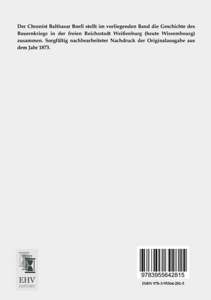 Der Chronist Balthasar Boell stellt im vorliegenden Band die Geschichte des Bauernkriegs in der freien Reichsstadt Weißenburg (heute Wissembourg) zusammen. Sorgfältig nachbearbeiteter Nachdruck der Originalausgabe aus dem Jahr 1873.