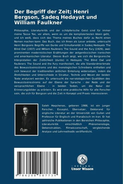 Philosophie, Literaturkritik und der schöpferische Geist sind für immer meine Tasse Tee, vor allem, wenn es um die kompliziertesten Ideen geht, und ich weiß, dass sich das Thema meines Buches dafür zu Recht einen Namen machen kann. Das Buch, das ich Ihnen als Leser anbiete, untersucht Henri Bergsons Begriffe von Durée und Simultaneität in Sadeq Hedayats The Blind Owl (1937) und William Faulkners The Sound and the Fury (1929), zwei prominenten modernistischen Erzählungen der zeitgenössischen iranischen und amerikanischen Literatur. Dieses Buch zeigt, wie sich die Bergsonsche Interpretation der Zeitlichkeit (durée) in Hedayats The Blind Owl und Faulkners The Sound and the Fury manifestiert, die alle Standardmerkmale des Bewusstseinsstroms und des monologischen Schreibens enthalten und sich bewusst der traditionellen zeitlichen Einteilung widersetzen, indem die Ähnlichkeiten und Unterschiede in Struktur, Technik und Wesen der beiden Texte analysiert werden. Es untersucht die narratologischen Qualitäten des Bewusstseinsstroms auf der Ebene der Sprache - der Rede und der vorsprachlichen Ebene - in beiden Texten, um die Natur der Erinnerungsbilder zu erörtern. Es wird eine praktische Hilfe für alle Forscher sein, die sich für Bergson und die Zeit in Konzept und Praxis interessieren.