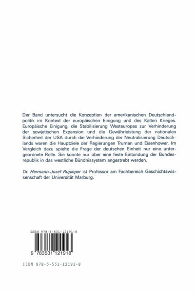 Der Verfasser untersucht die Konzipierung der amerikanischen Deutschlandpolitik im Kontext der europäischen Einigung und des kalten Krieges. Europäische Einigung, die Stabilisierung Westeuropas zur Verhinderung der sowjetischen Expansion und die Gewährleistung der nationalen Sicherheit der USA durch die Verhinderung der Neutralisierung Deutschlands waren die Hauptziele der Regierungen Truman und Eisenhower. Im Vergleich dazu spielte die Frage der deutschen Einheit nur eine untergeordnete Rolle. Sie konnte nur über eine feste Einbindung der BRD in das westliche Bündnissystem angestrebt werden."(...) Rupieper hat eine ungemein kenntnisreiche Analyse der amerikanischen Deutschlandpolitik vorgelegt. Sie bietet einen zuverlässigen Leitfaden für dieses schwierige, aber für die Geschichte der Bundesrepublik ungemein wichtige Kapitel der Nachkriegszeit."FAZ, 23.5.91