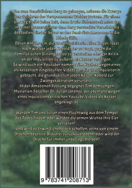 Um zum Gemütlichen Berg zu gelangen, müssen die Zwerge den Gefahren des Versponnenen Waldes trotzen. Für einen Umweg bleibt keine Zeit, denn Erwin Eichenstock muss das in seiner Brauerei unter dem Berg versteckte Vermächtnis des Jodlers finden, bevor es den Femi-Fist-Amazonen in die Hände fällt. Deren Anführerin, die Großinquisitorin Alice Karzer, lässt nach wie vor jeden Kobold, der es wagt, gegen die femifistischen Sittengesetze zu verstoßen oder gar Kritik an der Inquisition zu äußern, als Ketzer verfolgen. So wird auch ein Youtuber namens Tim Kuchen wegen eines als ketzerisch eingestuften Videos vor die Großinquisitorin gebracht, die grundsätzlich jeden Ketzer-Kobold zur Zwangskastration verurteilt. In der Amazonen-Festung begegnet Tim dem jungen Mysterien-Forscher Dr. Julian Jarones, der ebenfalls wegen eines inquisitionskritischen Youtube-Videos als Ketzer angeklagt ist.Werden Tim und Julian einen Fluchtweg aus dem Tempel des Todes finden, oder werden die armen Wichte ihre Eier verlieren? Und wird es Erwin Eichenstock schaffen, seine von einem Drachen besetzte Brauerei zurückzuerobern, oder wird der Drache für immer unbesiegt bleiben?