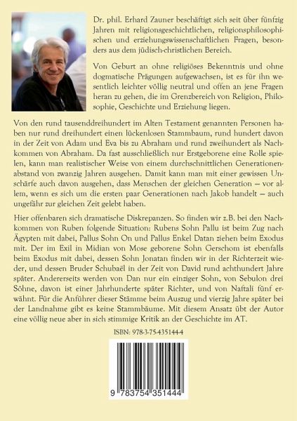 Von den rund tausenddreihundert im Alten Testament genannten Personen haben nur rund dreihundert einen lückenlosen Stammbaum, rund hundert davon in der Zeit von Adam und Eva bis zu Abraham und rund zweihundert als Nachkommen von Abraham. Da fast ausschließlich nur Erstgeborene eine Rolle spielen, kann man realistischer Weise von einem durchschnittlichen Generationenabstand von zwanzig Jahren ausgehen. Damit kann man mit einer gewissen Unschärfe auch davon ausgehen, dass Menschen der gleichen Generation - vor allem, wenn es sich um die ersten paar Generationen nach Jakob handelt - auch ungefähr zur gleichen Zeit gelebt haben. Hier offenbaren sich dramatische Diskrepanzen. So finden wir z.B. bei den Nachkommen von Ruben folgende Situation: Rubens Sohn Pallu ist beim Zug nach Ägypten mit dabei, Pallus Sohn On und Pallus Enkel Datan ziehen beim Exodus mit. Der im Exil in Midian von Mose geborene Sohn Gerschom ist ebenfalls beim Exodus mit dabei, dessen Sohn Jonatan finden wir in der Richterzeit wieder, und dessen Bruder Schubaël in der Zeit von David rund achthundert Jahre später. Andererseits werden von Dan nur ein einziger Sohn, von Sebulon drei Söhne, davon ist einer Jahrhunderte später Richter, und von Naftali fünf erwähnt. Für die Anführer dieser Stämme beim Auszug und vierzig Jahre später bei der Landnahme gibt es keine Stammbäume. Mit diesem Ansatz übt der Autor eine völlig neue aber in sich stimmige Kritik an der Geschichte im AT.