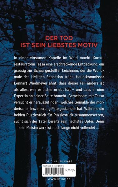 Beim Abendspaziergang macht Kunstrestauratorin Tessa eine erschreckende Entdeckung: In einer einsamen Kapelle im Wald stößt sie auf einen schaurig zur Schau gestellten Leichnam. Der Tote trägt die Wundmale des Heiligen Sebastian. Der mit den Ermittlungen betraute Hauptkommissar Lennart Wiedmeyer ahnt, dass dieser Fall anders ist als alles, was er bisher erlebt hat - und dass er eine Expertin an seiner Seite braucht. Gemeinsam mit Tessa versucht er herauszufinden, welches Gemälde der mörderischen Inszenierung Pate gestanden hat. Während die beiden, ausgehend von der Identität des Toten, Puzzlestück für Puzzlestück zusammensetzen, sucht sich der Täter bereits sein nächstes Opfer. Denn sein Meisterwerk ist noch lange nicht vollendet ...