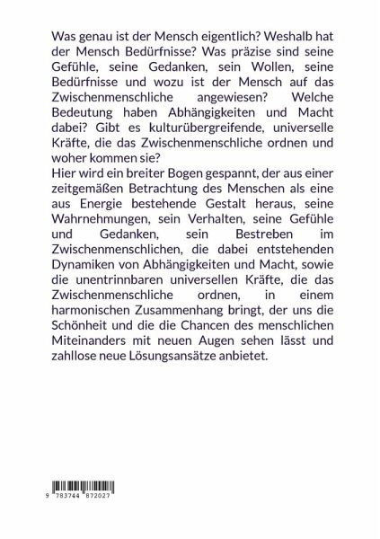 Was genau ist der Mensch eigentlich? Weshalb hat der Mensch Bedürfnisse? Was präzise sind seine Gefühle, seine Gedanken, sein Wollen, seine Bedürfnisse und wozu ist der Mensch auf das Zwischenmenschliche angewiesen? Welche Bedeutung haben Abhängigkeiten und Macht dabei? Gibt es kulturübergreifende, universelle Kräfte, die das Zwischenmenschliche ordnen und woher kommen sie? Hier wird ein breiter Bogen gespannt, der aus einer zeitgemäßen Betrachtung des Menschen als eine aus Energie bestehende Gestalt heraus, seine Wahrnehmungen, sein Verhalten, seine Gefühle und Gedanken, sein Bestreben im Zwischenmenschlichen, die dabei entstehenden Dynamiken von Abhängigkeiten und Macht, sowie die unentrinnbaren universellen Kräfte, die das Zwischenmenschliche ordnen, in einem harmonischen Zusammenhang bringt, der uns die Schönheit und die die Chancen des menschlichen Miteinanders mit neuen Augen sehen lässt und zahllose neue Lösungsansätze anbietet.