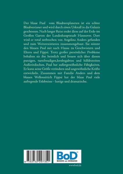 Der blaue Paul vom Blaubeerplaneten ist ein echter Blaubeerianer und wird durch einen Urknall in die Galaxis geschossen. Nach langer Reise endet diese auf der Erde im Großen Garten der Landeshauptstadt Hannover. Dort wird er total zerbrochen von Angelina Anders gefunden und zum Weiterexistieren zusammengebaut. Sie nimmt den blauen Paul mit nach Hause zu Geschwistern und Eltern und Fippsi. Trotz großer persönlicher Probleme behalten sie ihn heimlich und freuen sich über diesen putzigen, turnfreudigen, lernbegabten und hilfsbereiten Außerirdischen. Paul hat außergewöhnliche Fähigkeiten. Er kann seine Größe verändern und ungewöhnliche Kräfte entwickeln. Zusammen mit Familie Anders und dem blauen Wellensittich Fippsi hat der blaue Paul viele aufregende Erlebnisse - lustige und dramatische.