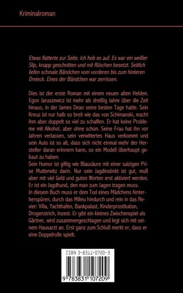 Dies ist der erste Roman mit einem neuen alten Helden. Egon Jaruszewicz ist mehr als dreißig Jahre über die Zeit hinaus, in der James Dean seine besten Tage hatte. Sein Kreuz ist nur halb so breit wie das von Schimanski, macht ihm aber doppelt so viel zu schaffen. Er hat keine Probleme mit Alkohol, aber ohne schon. Seine Frau hat ihn vor Jahren verlassen, sein verwittertes Haus verkommt und sein Auto ist so alt, dass sich nicht einmal mehr der Hersteller daran erinnern kann, so ein Modell überhaupt gebaut zu haben. Sein Humor ist giftig wie Blausäure mit einer salzigen Prise Mutterwitz darin. Nur sein Jagdinstinkt ist gut, muß aber mit viel Geld und guten Worten erst aktiviert werden. Er ist ein Jagdhund, den man zum Jagen tragen muss. In diesem Buch muss er dem Tod eines Mädchens hinterherspüren, durch das Milieu hindurch und rein in das Revier: Villa, Yachthafen, Bankpalast, Kinderprostitution, Drogenstrich, Inzest. Er gibt ein kleines Zwischenspiel als Gärtner, wird zusammengeschlagen und legt sich mit seinem Hausarzt an. Erst ganz zum Schluß merkt er, dass er eine Doppelrolle spielt.